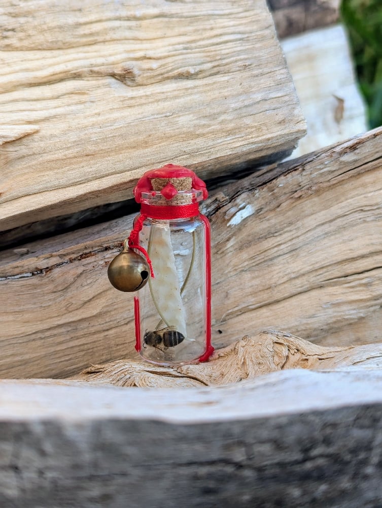 Sealed in red beeswax and holding the essence of our beehives - bee, wax, and pine, this charm awakens mental sharpness and unwavering attention. Like the bee in flight, it channels purpose, persistence, and precision. Shake gently for the bell to ring in times of study, deep work, or when your mind must become a lantern in the fog.